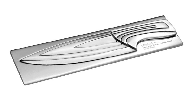 It’s a designer knife set that appears to be created from a single block of stainless steel.